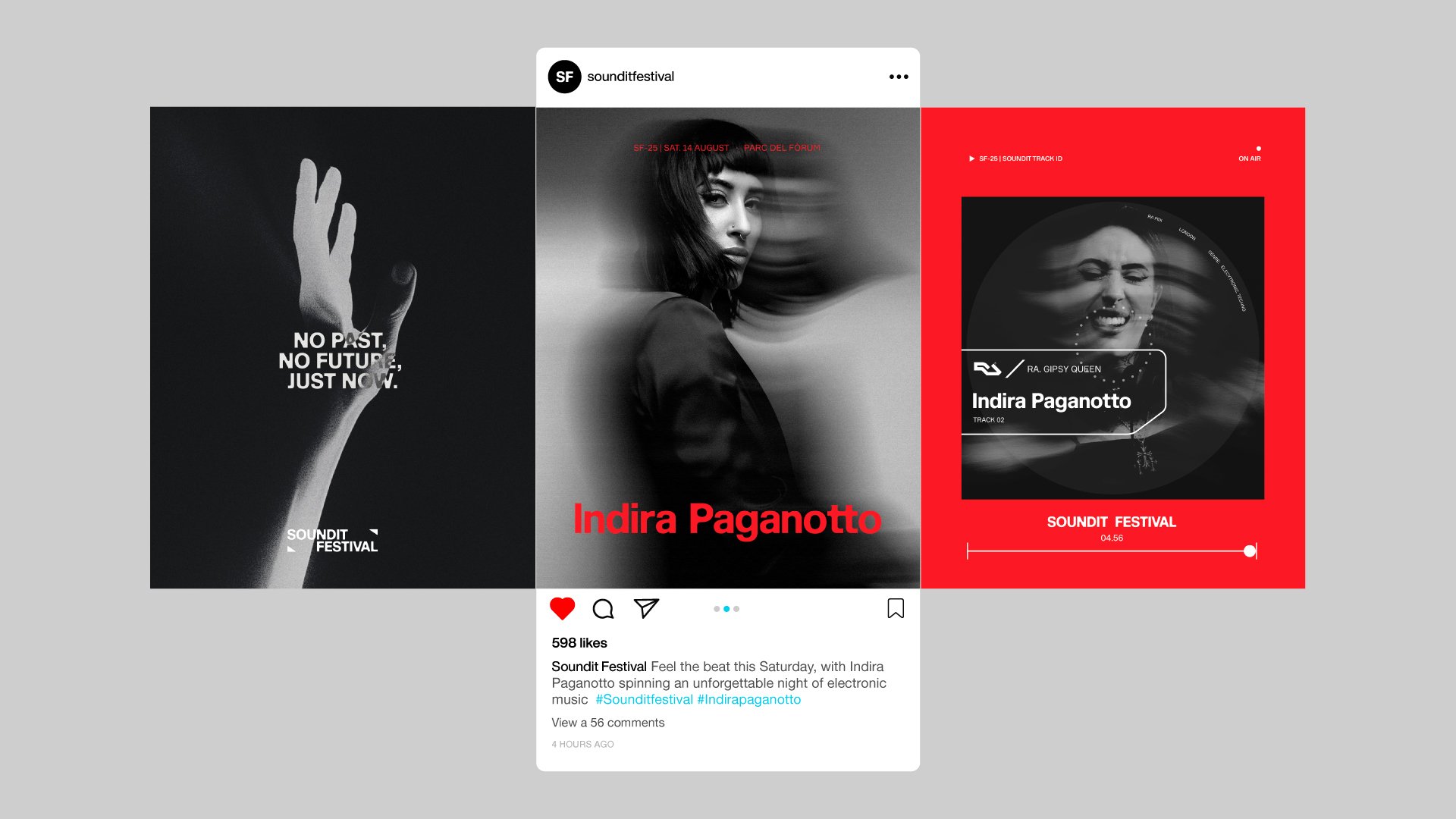 A partir de la base gráfica de Soundit, desarrollé una serie de piezas de motion graphics (animaciones tipográficas y clips introductorios para sus canales de comunicación) que refuerzan la identidad visual y aportan dinamismo y presencia en redes sociales. El objetivo fue traducir la dirección artística en movimiento, respetando el tono y la estética de la marca.